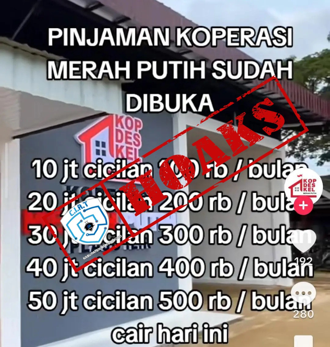 Sejumlah akun TikTok mengunggah video yang mengatasnamakan Koperasi Desa Merah Putih dan menawarkan pinjaman bagi melalui brosur masyarakat berisi skema angsuran bulanan dan tahunan, dengan nominal pinjaman mulai dari Rp5 juta hingga ratusan juta rupiah. Unggahan tersebut menampilkan narasi seolah-olah program itu merupakan pinjaman berbasis online untuk seluruh masyarakat Indonesia, sehingga memunculkan kesan sebagai layanan resmi pemerintah.