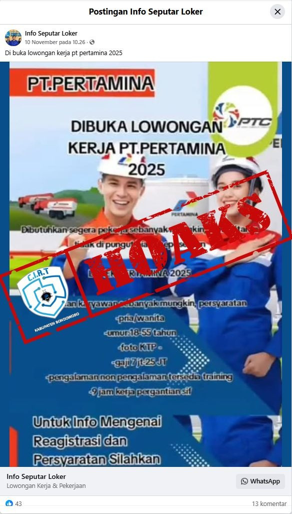 Beredar sebuah unggahan di media sosial Facebook yang memberikan informasi mengenai poster lowongan kerja mengatasnamakan PT Pertamina pada November 2025. Lowongan kerja tersebut menawarkan gaji mulai dari Rp7 juta hingga Rp25 juta.