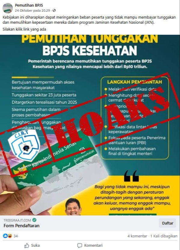Beredar unggahan di media sosial Facebook tautan yang diklaim untuk akses pemutihan tunggakan iuran Jaminan Kesehatan Nasional (JKN). Unggahan tersebut diunggah pada 24 Oktober 2025.