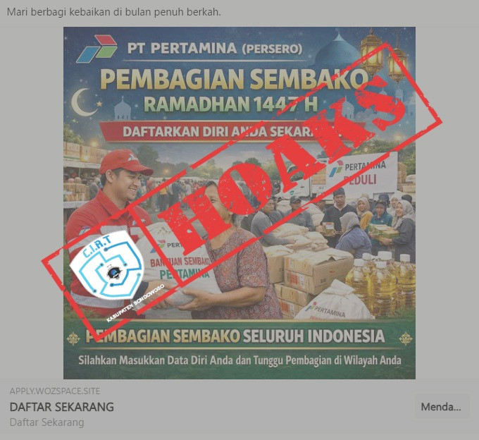 Sebuah unggahan Facebook oleh akun “Tina situmorang1” (17/02/2026) mengklaim PT Pertamina (Persero) membagikan paket sembako Ramadhan 1447 H dan mengarahkan pendaftaran melalui tautan yang meminta data pribadi serta nomor Telegram