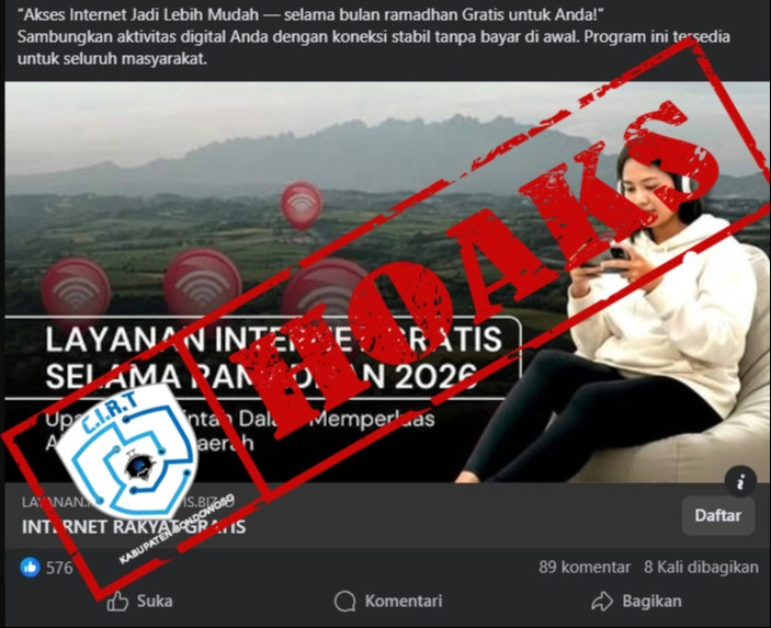 Beredar unggahan di media sosial Facebook berisi tautan yang diklaim mengatasnamakan Internet Rakyat untuk mendapatkan internet gratis selama bulan Ramadan 2026.