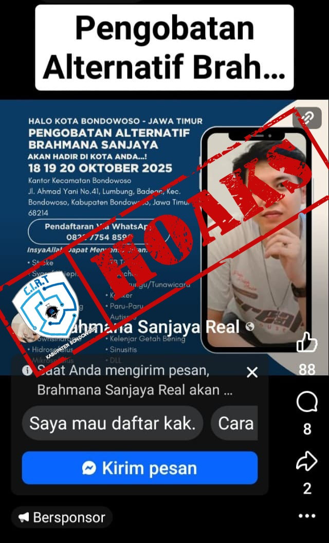 Beredar sebuah informasi di Facebook tentang adanya Pengobatan Alternatif Brahmana Sanjaya yang akan dilaksanakan di Kantor Kecamatan Bondowoso Jl. Ahmad Yani No. 41, Lumbung, Badean, Kec. Bondowoso, Kabupaten Bondowoso, Jawa Timur 68214 pada tanggal 18 19 20 Oktober 2025.