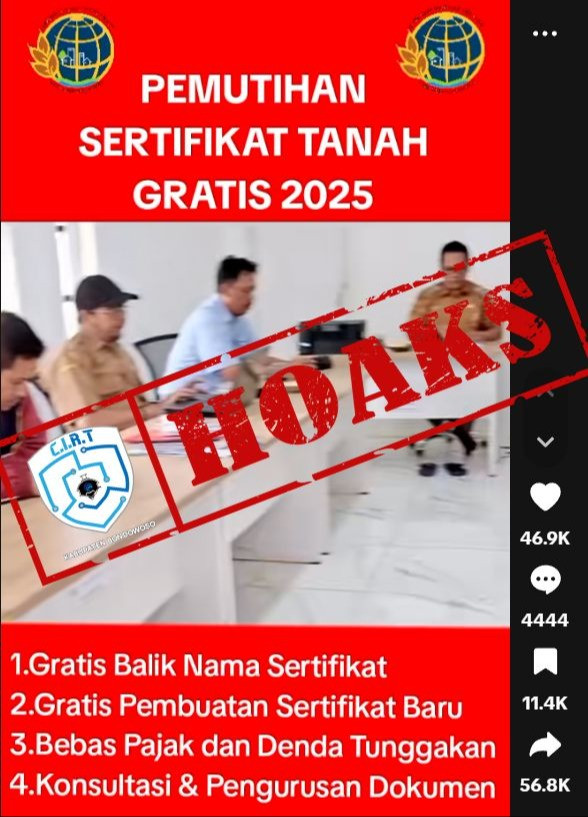 [HOAKS] BPN Tawarkan Pembuatan Sertifikat Tanah Gratis Lewat TikTok